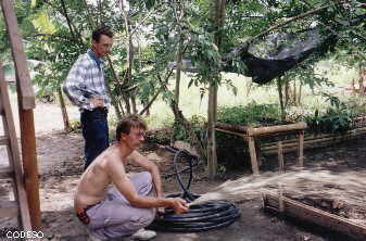 Se instaló un sistema individual de energía fotovoltaica con un panel solar Isofoton 110 W una batería estacionaria MAC 150 Ah y un inversor Tripplite APS de 2000 W para generar 110 V AC (alterno). El sistema abastece una bomba de agua Pedrollo PK60 para el uso de la casa y para el riego de cultivos como pimienta negra y plátanos. Además abastece la energía para la casa.